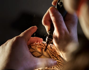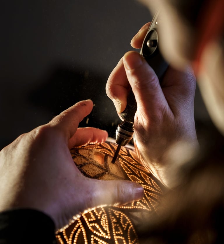 Lorsqu’elle rencontre son matériau de prédilection, la calebasse, à travers la musique africaine, l’évidence se fait d’elle-même. Elle détourne le matériau et perfectionne des techniques complexes comme la gravure, le ciselage ou le pointillisme, travaillant directement sur la matière.