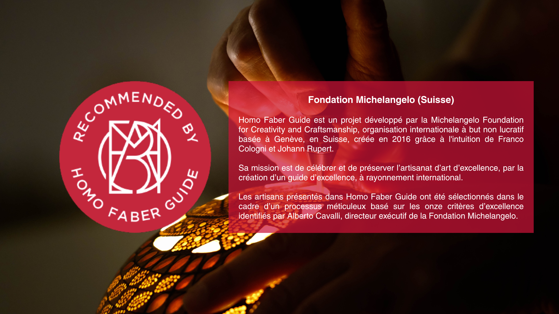 Inscription au guide des artisans d'art d'excellence de la Fondation suisse MichelAngelo " Homo Faber"